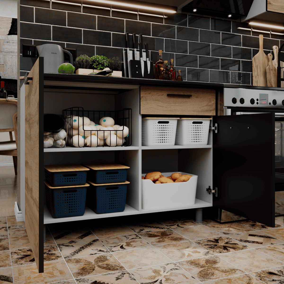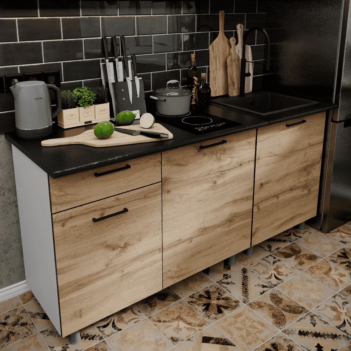 Представляем вашему вниманию кухонный гарнитур ЛАВАНДА, который идеально воплощает черты лофта и эко-минимализма: эта стильная кухня привлекает взгляд фасадами в насыщенном декоре «дуб золотой» с реалистичной древесной текстурой. Готовая кухня построена на эффектном контрасте теплых оттенков дерева и графичных черных акцентов, создавая уютную атмосферу. Верхний ярус без лицевой фурнитуры визуально облегчает пространство, а нижние секции обеспечивают высокую функциональность. Рабочая зона для удобства монтажа комплектуется двумя столешницами размером 1100х600х26 мм и 600х600х26 мм, что позволяет гибко организовать пространство. Благодаря регулируемым опорам и продуманной эргономике, эта кухня для дома станет практичным решением, сочетающим современный дизайн с удобством ежедневного использования.