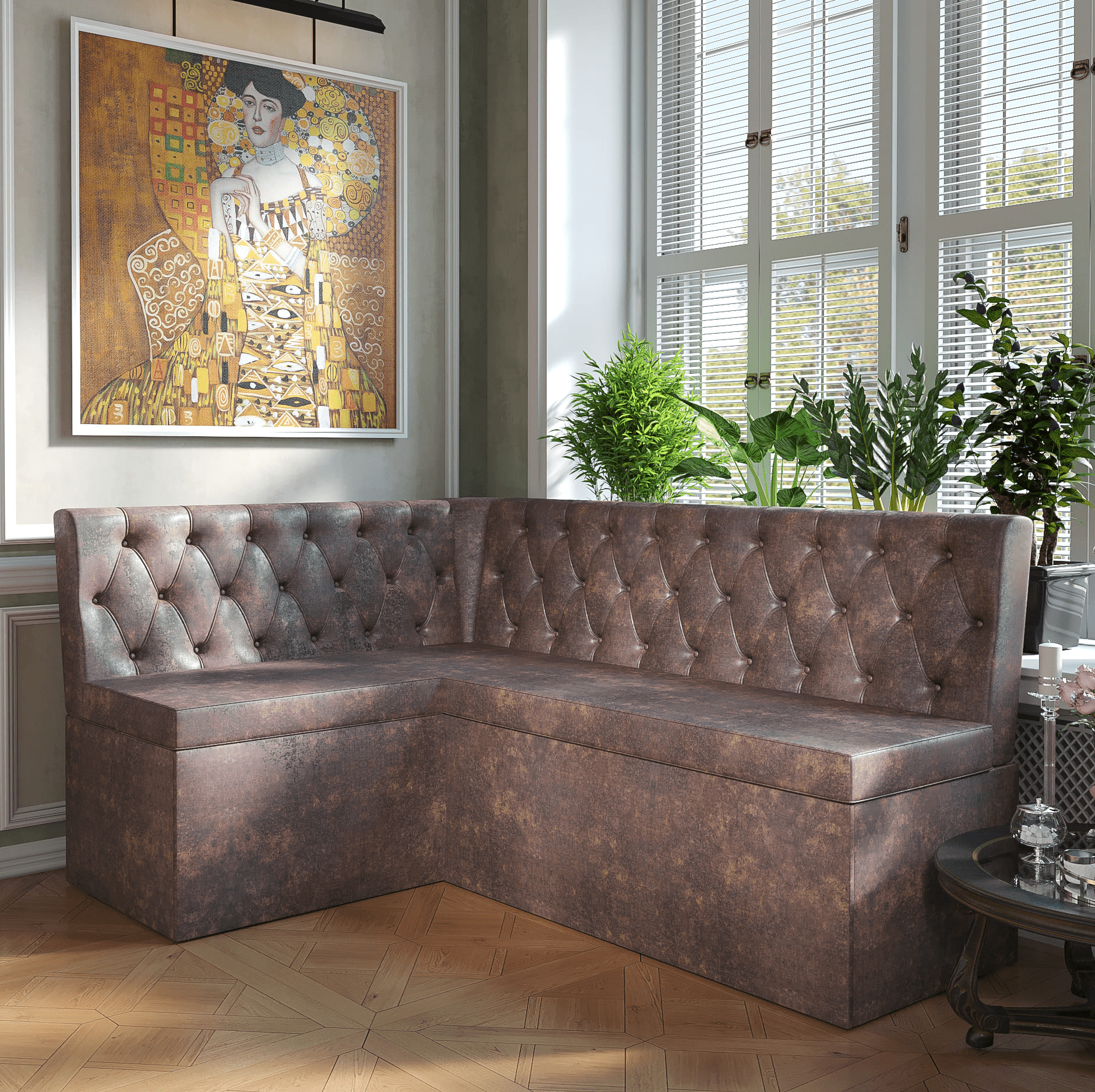 Элегантный и невероятно комфортный кухонный уголок ВЕНЕЦИЯ коричневый велюр— это идеальное решение для создания атмосферы премиального уюта и классического стиля в обеденной зоне. Модель притягивает взгляд благодаря изысканной стяжке капитоне (каретной стяжке) ручной работы, выполненной из цельного отреза мягкого велюра и декорированной пуговицами в тон, что делает этот велюровый диван для кухни центральным элементом интерьера. При габаритах 1590x1180 мм изделие отличается исключительной мягкостью благодаря упругому наполнителю из пенополиуретана, обеспечивающему максимальный комфорт во время отдыха. Если вы планируете купить кухонный уголок с ящиками, данная модель станет практичным выбором: встроенный подъемный механизм открывает легкий доступ к двум вместительным секциям (100х34х35 см) для хранения домашней утвари или текстиля. Такая мебель для кухни с каретной стяжкой обладает универсальным типом сборки, позволяя адаптировать угол под особенности вашей планировки. Ваше решение заказать угловой диван 1590 мм — это залог долговечности, функциональности и безупречной эстетики в вашем доме.